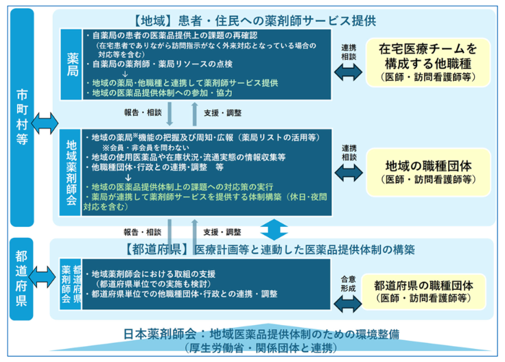 ・地域において限られた資源を有効かつ適切に活用し、地域住民のために必要な薬剤師サービスを継続的に提供していくため、これまで各薬局の個々の努力により、また薬剤師会組織による会員相互扶助の観点で取り組んできた医薬品・薬剤師サービス提供を「地域体制」の観点から再点検・再構築する必要がある。